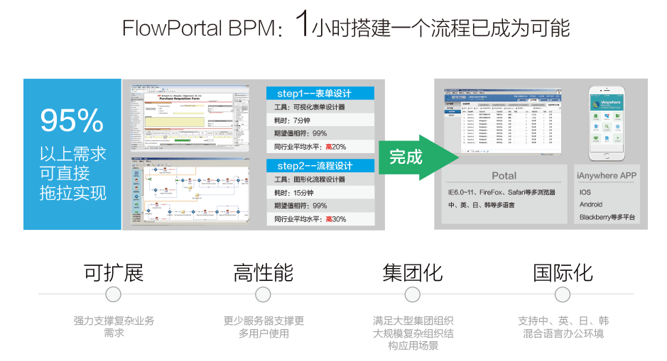 FlowPortal. net具有方便、易用和可擴(kuò)展的特性,一方面在FlowPortal. net中流程、表單、報(bào)表一切設(shè)計(jì)皆是可視化免編程的,另一方面FlowPortal. net采用微軟.net技術(shù)做為流程和表單的基礎(chǔ)技術(shù),具有良好的開放性、可擴(kuò)展性和彈性,是企業(yè)進(jìn)行業(yè)務(wù)流程管理的理想戰(zhàn)略平臺(tái)。